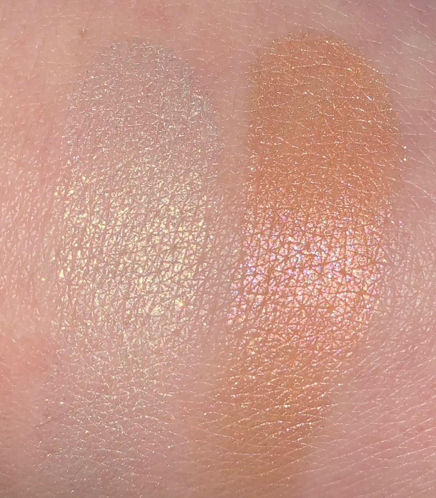 Rainbow swirl- contained two shades sherbert day and creamsicle. Sherbert is a peachy pink with silver flecks in it. Creamsicle is a baby pink with purple and blue in it.